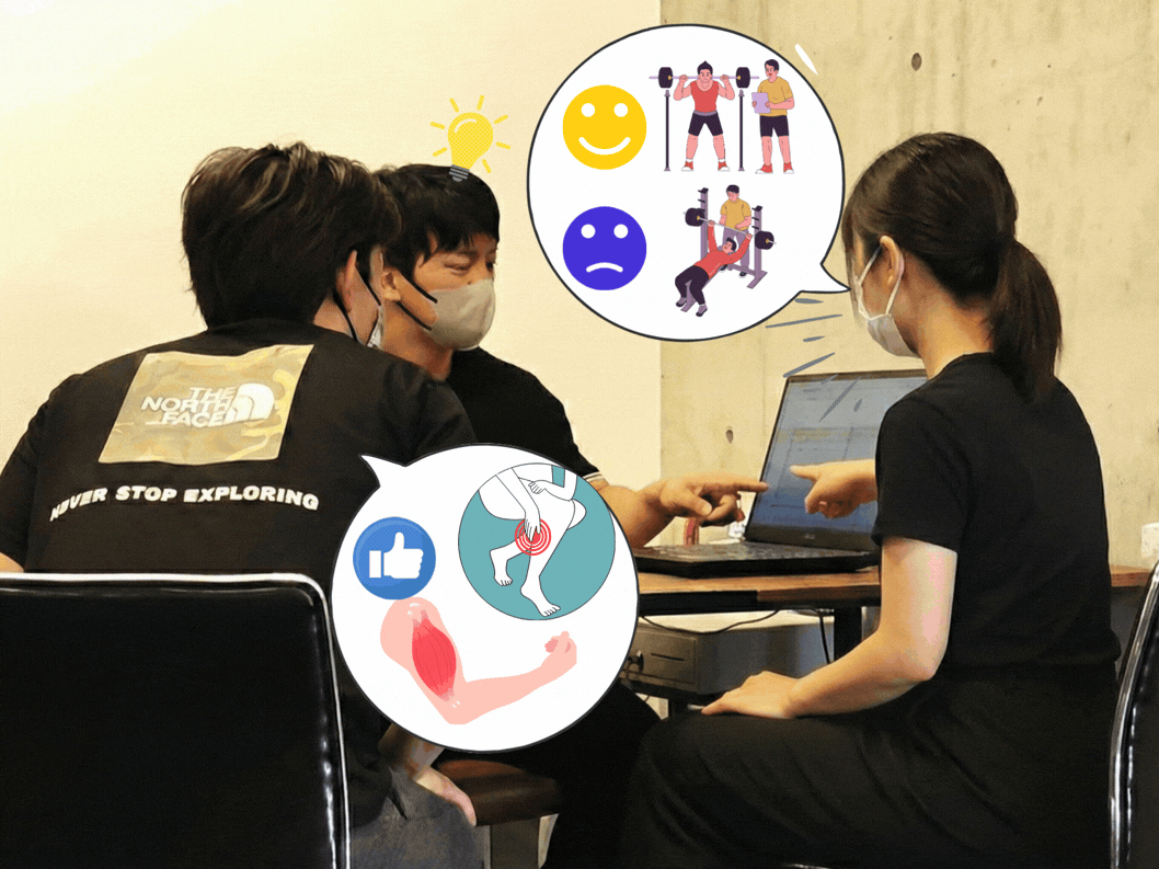 次回のトレーニングに向けてヘルスチェックと共に今回のそれぞれお2人のトレーニング内容の評価を一緒に行います。
